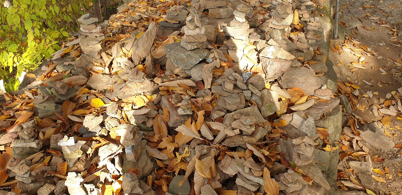 - 계단 중간 쉼터: 은행나무와 단풍나무가 함께 어우러지는 구도.