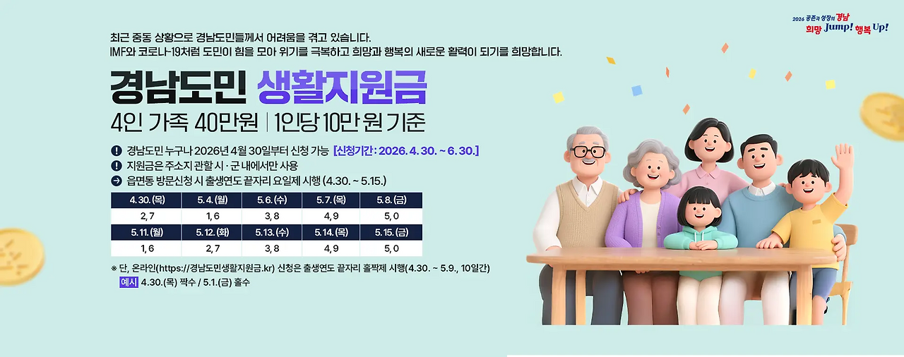 경남 지역 경제 회복과 도민 생활 안정을 위해 지급되는 ‘경남 도민생활지원금’ 신청이 본격적으로 시작됩니다. 이번 지원금은 1인당 10만 원이 지급되는 정책성 지원금으로, 일정 요건을 충족하는 경남 도민이라면 누구나 신청할 수 있다는 점에서 관심이 집중되고 있습니다. 특히 신청 초기 혼잡을 줄이기 위한 홀짝제와 요일제가 동시에 운영되며, 온라인과 오프라인 모두 신청이 가능하다는 점이 특징입니다.