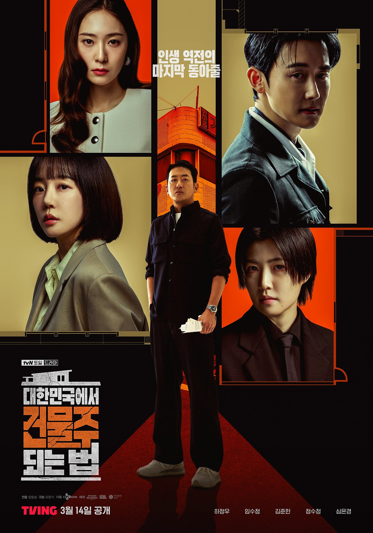 정리하면 대한민국에서 건물주 되는법은 제목의 가벼움과 내용의 무게감이 강하게 대비되는 작품입니다. 생계형 건물주라는 현실적인 출발점 위에 가짜 납치극, 재개발, 금융자본, 가족 붕괴, 경찰 수사가 겹쳐지면서 단순 드라마가 아니라 생활형 범죄 서스펜스로 확장됩니다. 출연진은 하정우, 임수정, 김준한, 정수정, 심은경을 중심으로 매우 탄탄하고, 전양자, 오동기, 고주란, 김균 같은 주변 인물도 서사를 밀어주는 힘이 큽니다. 현재 기준 총 12부작 편성이며, 2026년 3월 29일에는 6회 본방이 진행되고 있습니다. 재방송은 tvN과 OCN 등에서 확인되고, OTT 다시보기는 TVING에서 가능한 흐름입니다.
