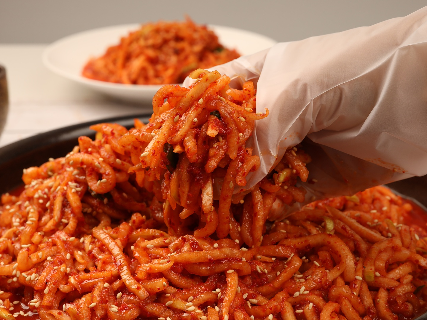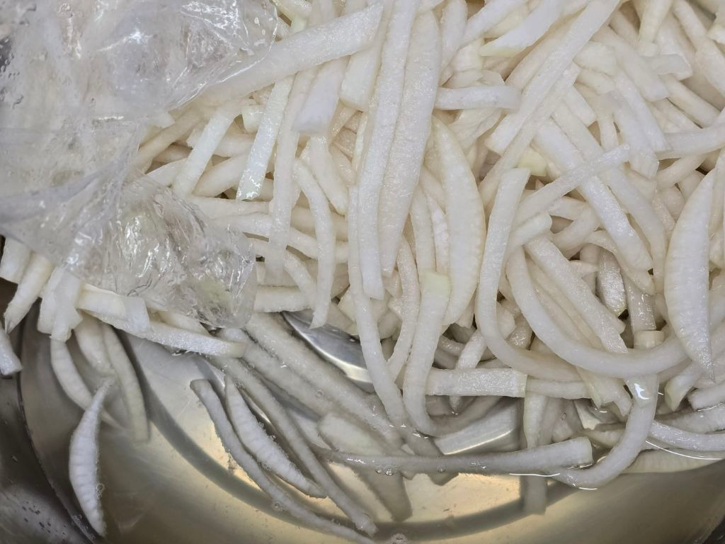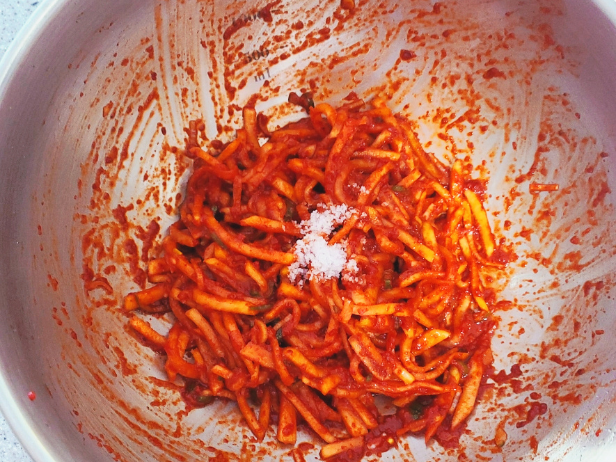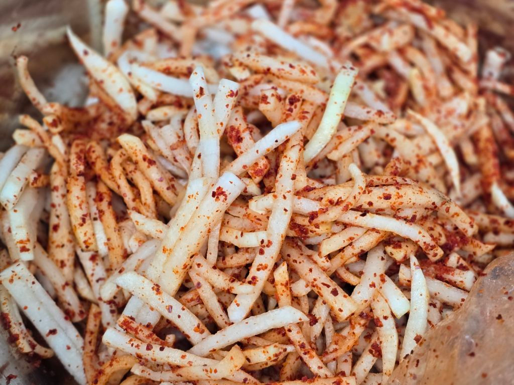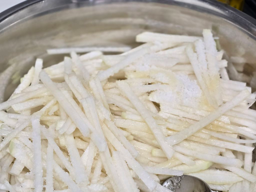 이 과정이 부족하면 무가 싱겁고 질기며, 과하면 흐물거리는 식감이 됩니다. 절임 후에는 무에서 나온 물을 버리고, 손으로 가볍게 눌러 물기를 정리합니다. 이때 너무 세게 짜면 무의 단맛과 수분이 과도하게 빠져나가므로 ‘가볍게 정리한다’는 느낌이 중요합니다. 적당한 수분이 남아 있어야 이후 양념이 자연스럽게 퍼집니다.