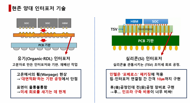특히 기존 실리콘 인터포저 대비 제조비 절감 효과가 크고, 패키지 두께를 25% 이상 줄일 수 있어 효율적인 고집적 설계가 가능하다.