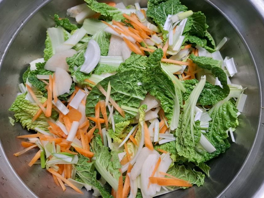 물기를 제거한 봄동에 채 썬 양파와 당근을 넣고 준비된 양념을 넣어 가볍게 버무립니다.