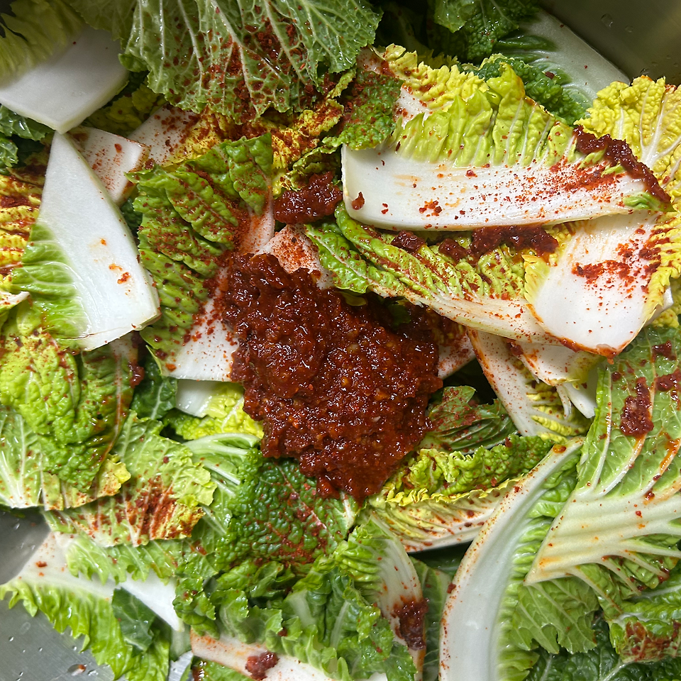 양념은 고춧가루와 액젓의 비율이 가장 중요합니다. 고춧가루 5큰술에 멸치액젓 3큰술을 기본 비율로 맞추고, 단맛은 설탕 1큰술과 매실청 2큰술로 조절합니다.