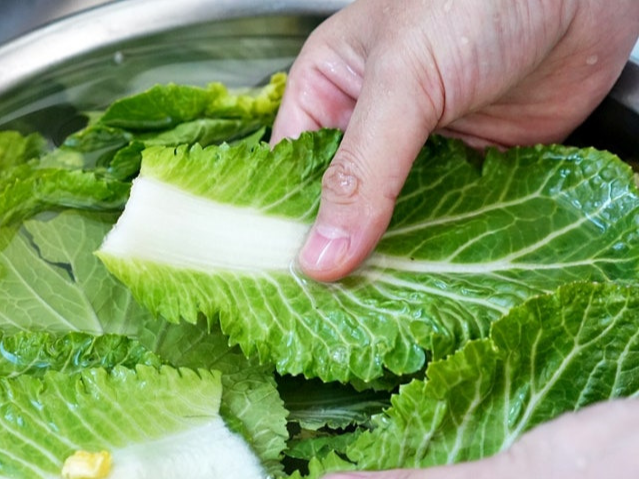손질 단계에서 가장 먼저 할 일은 ‘밑동 정리’입니다. 봄동 밑동이 지나치게 단단하면 씹는 식감이 거칠어지고, 잎과 줄기의 익힘(절임) 속도가 달라져 맛이 분리됩니다. 밑동을 V자 형태로 살짝 도려내고, 큰 잎은 2-3등분으로 썰어 크기를 맞춰주세요. 아주 작은 잎은 그대로 두면 보기에도 예쁘고, 양념이 스며드는 면적이 넓어져 맛이 좋아집니다. 세척은 흐르는 물에 대충 헹구는 수준이 아니라, 물에 담가 살살 흔들어 모래를 빼는 방식이 안정적입니다. 2-3번 정도 물을 갈아가며 씻고, 마지막에는 채반에서 물기를 충분히 빼야 절임 농도가 흔들리지 않습니다.