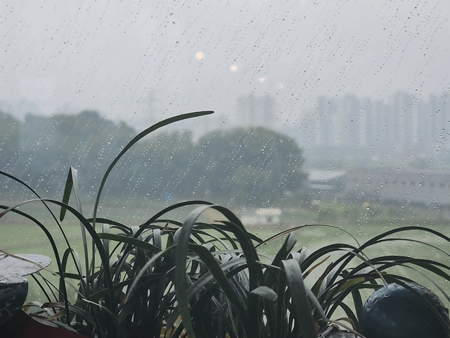창 밖에는 비가 내리고 있습니다.