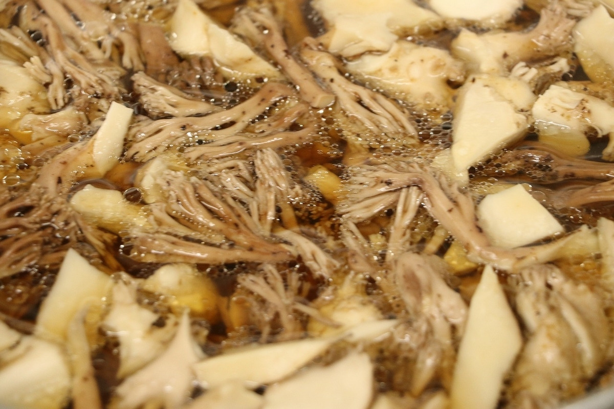 - 데친 싸리버섯을 다져 양파, 파와 함께 볶은 뒤 간장으로 간을 맞춥니다.