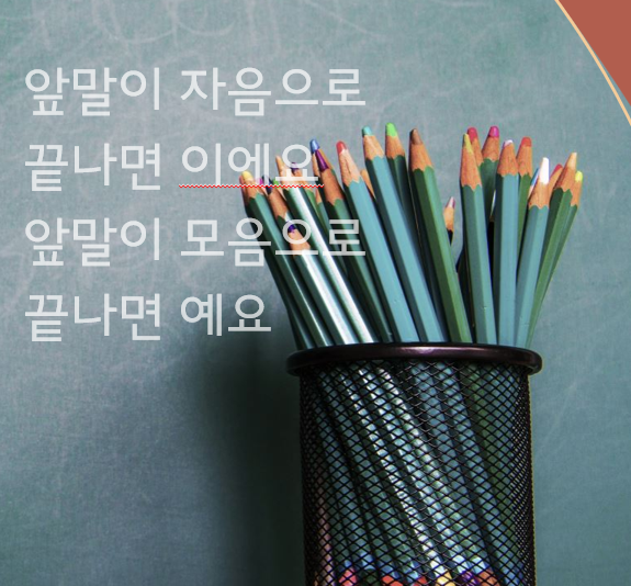 따라서 정확한 맞춤법을 쓰기 위해서는 ‘예요 / 이에요’ 두 가지 구조만 기억하는 것이 좋습니다.