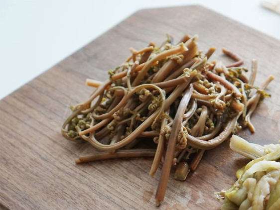 - 고사리와 토란대는 끓는 물에 소량의 소금과 맛술을 넣고 각각 3분, 2분 데친 뒤 찬물에 헹구고 물기를 꽉 짭니다. 고사리는 들큰한 산미를 빼고, 토란대는 아린맛을 제거합니다.