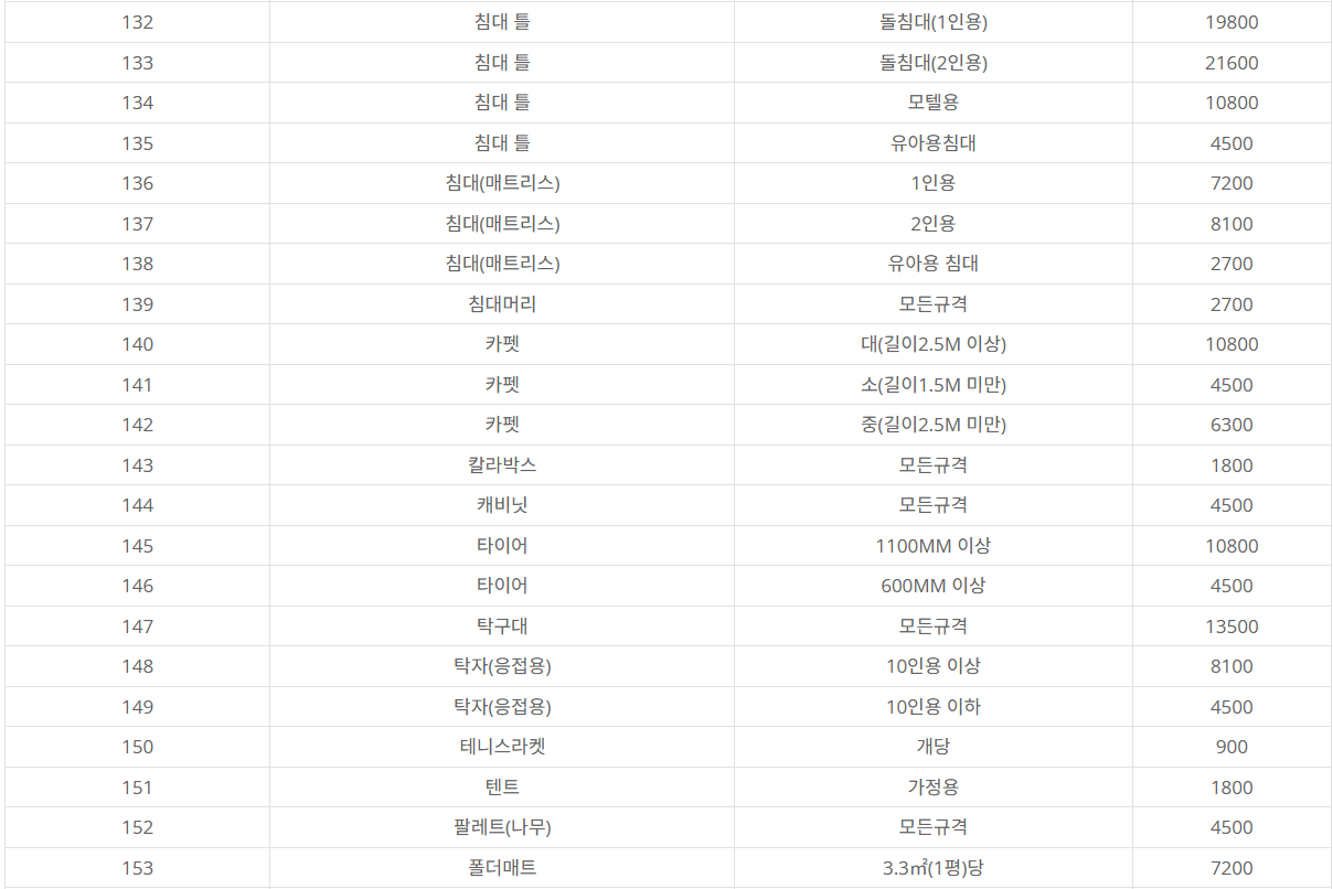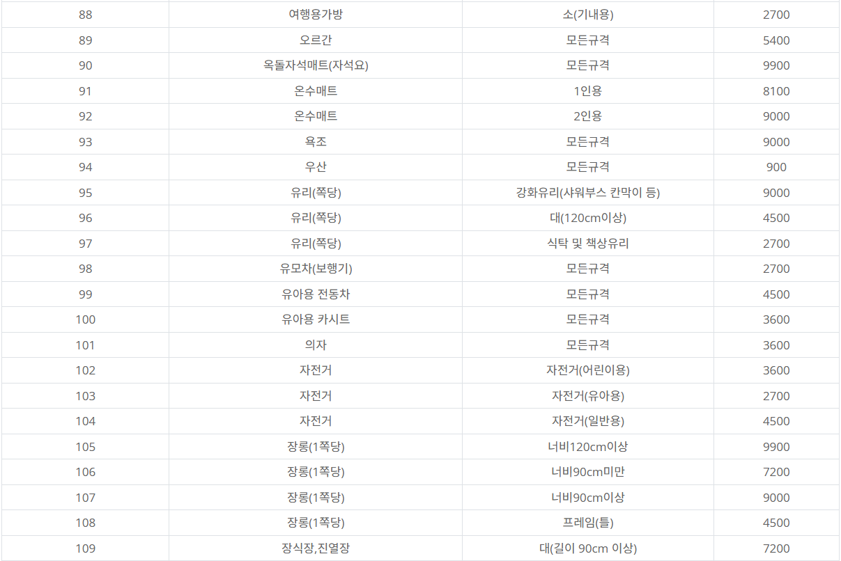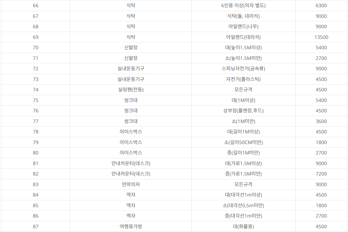 대형폐기물 수수료는 품목과 크기에 따라 상이합니다. 일반적으로 가구류가 가장 많은 비중을 차지하며, 가전제품은 무상수거 대상 여부에 따라 차이가 발생합니다. 대표적인 예시는 다음과 같습니다.