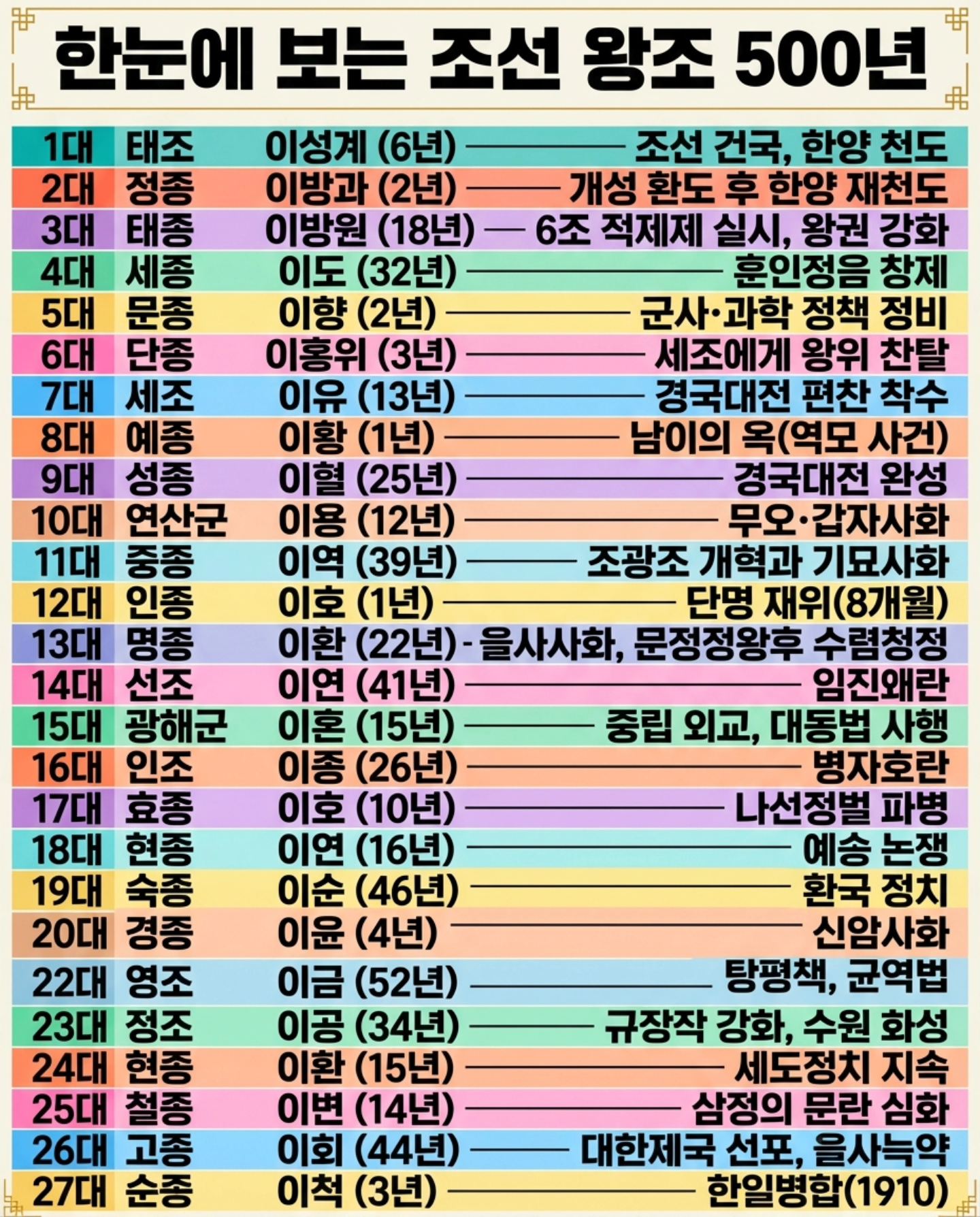 조선왕조 계보는 27대 왕의 순서를 정확히 이해하는 것이 가장 중요하며, 각 왕의 핵심 업적과 정치적 특징을 함께 정리해야 기억이 오래 유지됩니다. 다음은 재위 순서와 핵심 특징을 중심으로 정리한 계보입니다.